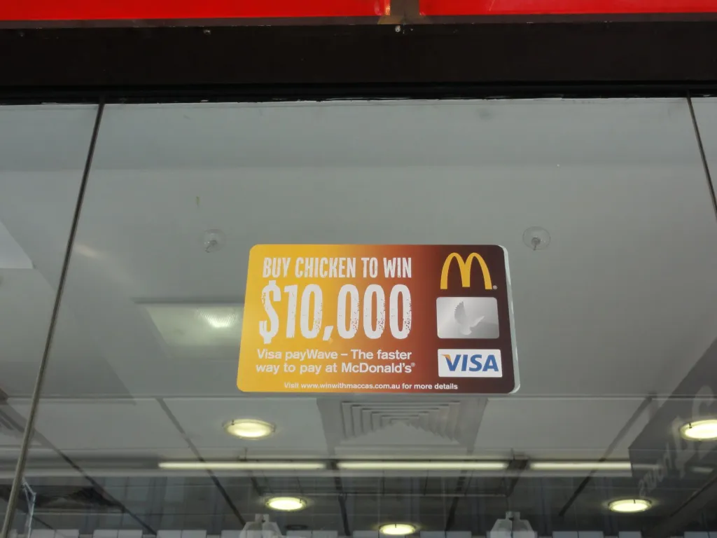 - Visa payWave: Ich habe eine Visa Debit Karte, mit der ich die sogenannte Visa payWave Funktionalität nutzen kann. Die erlaubt es mir für Einkäufe unter $100 einfach meine Karte vor einem Reader zu „winken“ und der Einkauf ist getätigt. Keine Unterschrift oder PIN-Eingabe nötig. McDonalds bietet z.B. diese Bezahlmöglichkeit an.